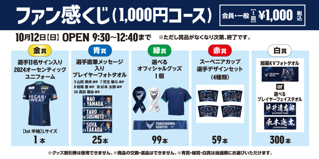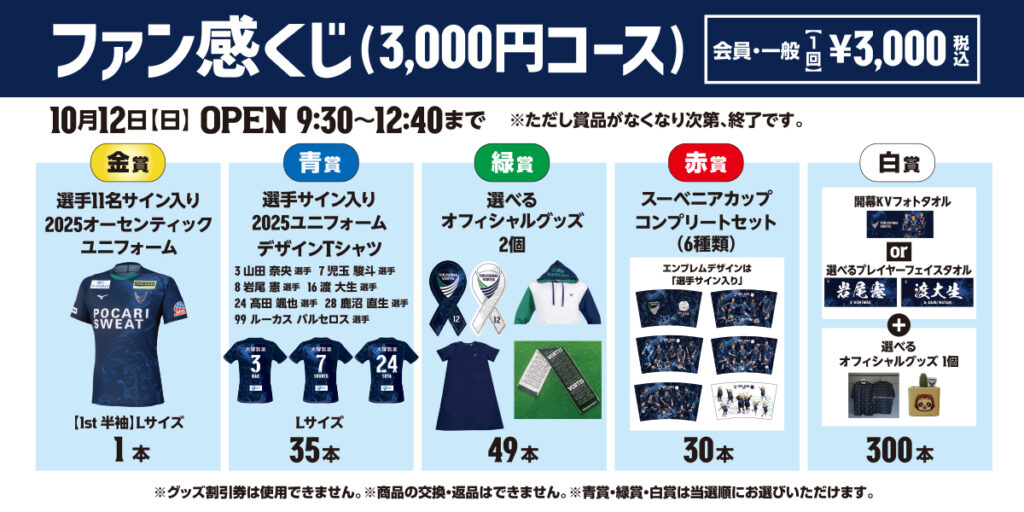 「3,000円コース」と「1,000円コース」の2種類のくじを販売!選手サイン入りグッズなどの景品が当たるチャンス!ぜひご参加ください!