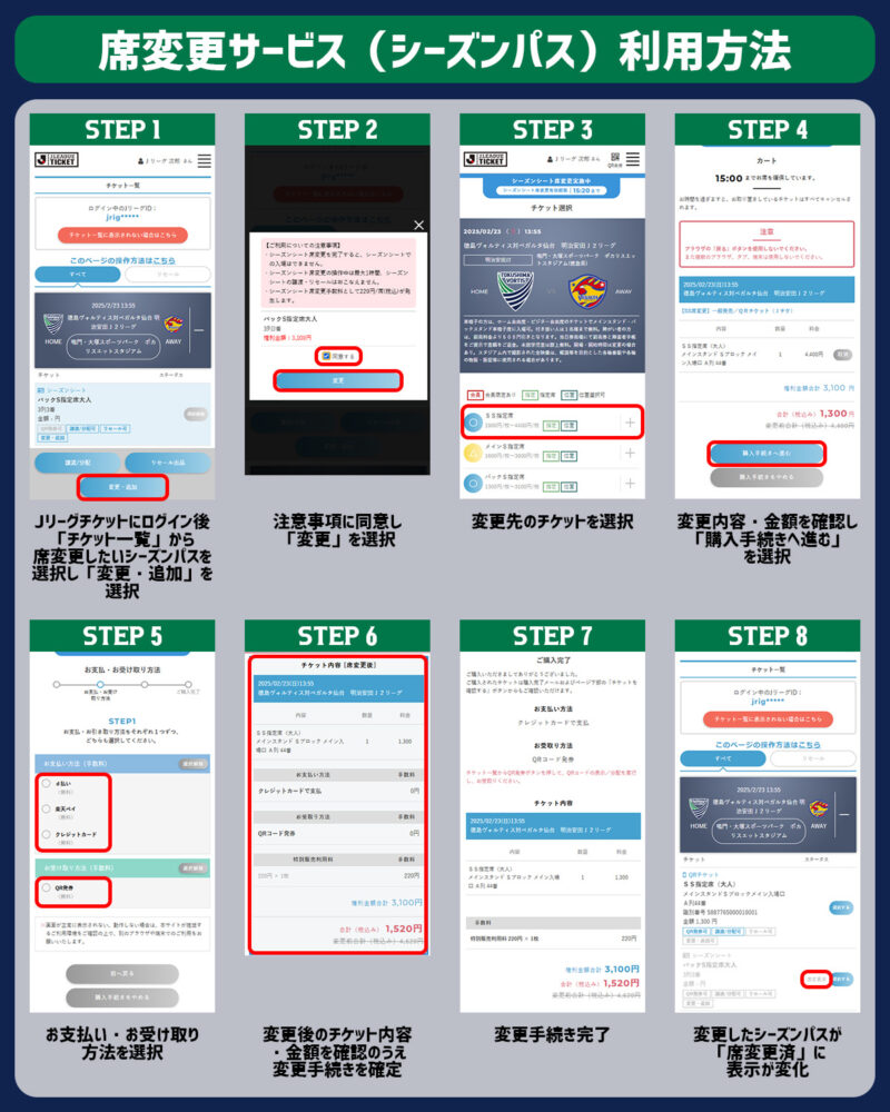 ご自身のシーズンパスの席種に応じた権利金額をもとに、1試合単位でJリーグチケットにて会員料金との差額をお支払いいただくことで別の座席へ買い直しができるサービスです。