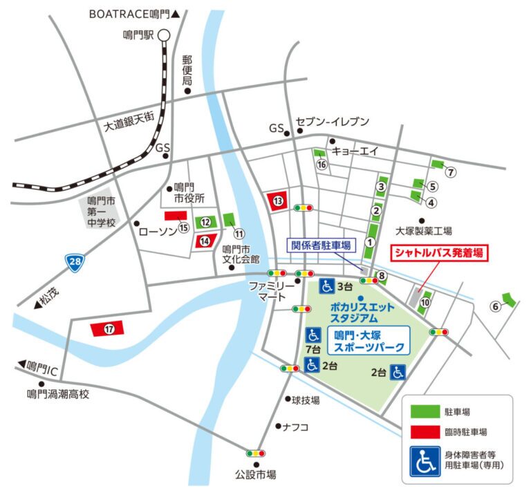 ※「オロナミンC球場」の改修工事に伴い、現在「鳴門・大塚スポーツパーク」には使用できない駐車場もございますのでご注意ください。