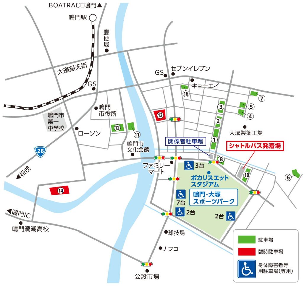 ※「オロナミンC球場」の改修工事に伴い、現在「鳴門・大塚スポーツパーク」には使用できない駐車場もございますのでご注意ください。